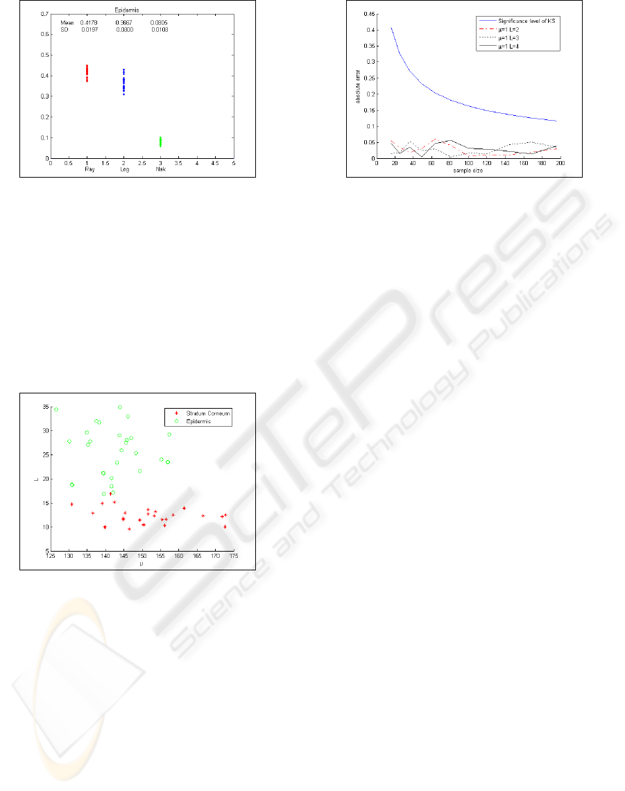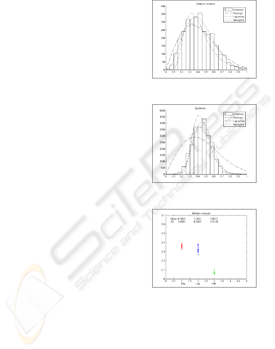 and Nakagami) to differentiate the speckle distribution according to the skin layer is analysed. For each pdf,