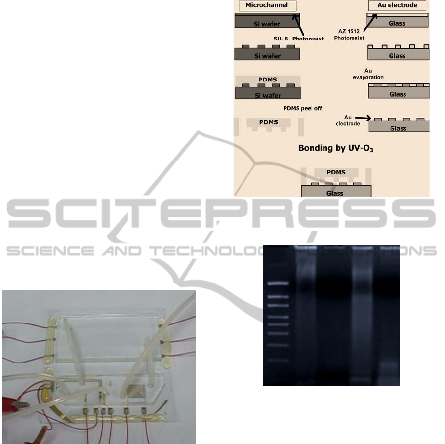microchannels, cell lysis and PCR modules. Gold-microelectrodes were used to produce electrochemical
