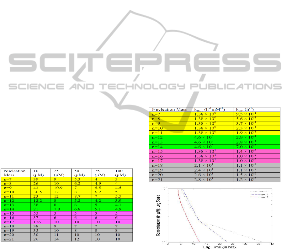 lag times for each value of the nucleation mass. This