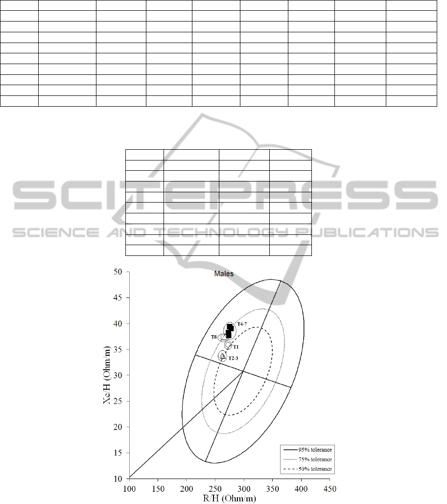 bioelectrical values as Resistance, Reactance, Phase