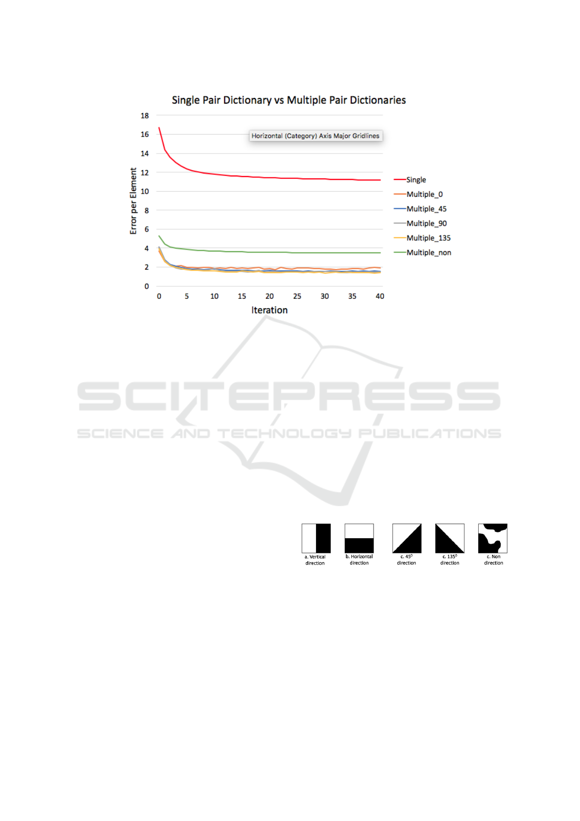 The dictionaries are clustered based on the edge orientation that categorized into 5 clusters: 0, 45, 90, 135, and