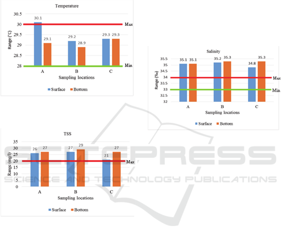 temperature, pH, and DO parameters show that they are in safe criteria, but TSS and salinity parameters