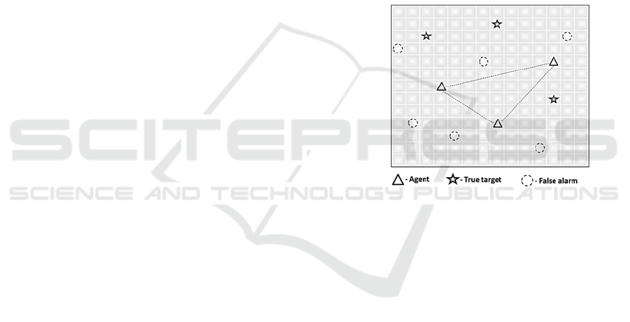 dummy targets and several searching robots (agents).