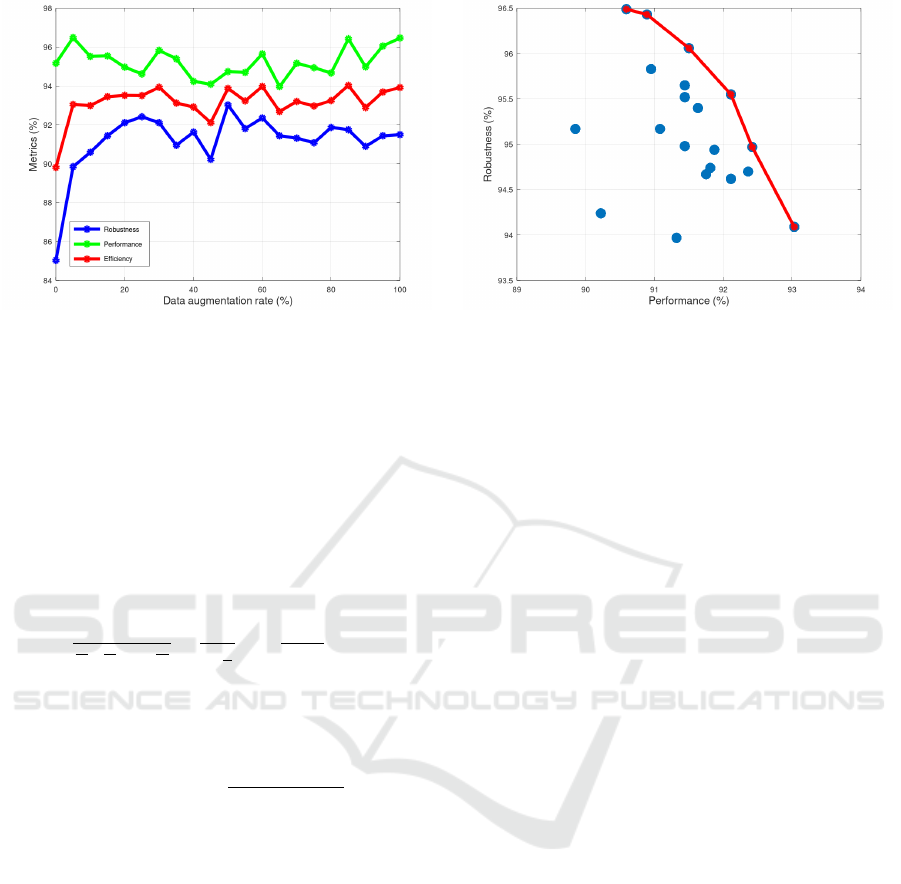 Data augmentation rate (R%) Performance (%) Robustness (%) Efficiency (%)