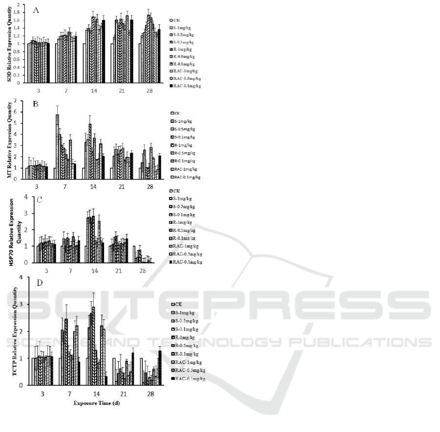 genes (SOD, MT, HSP70, TCTP) were compared to
